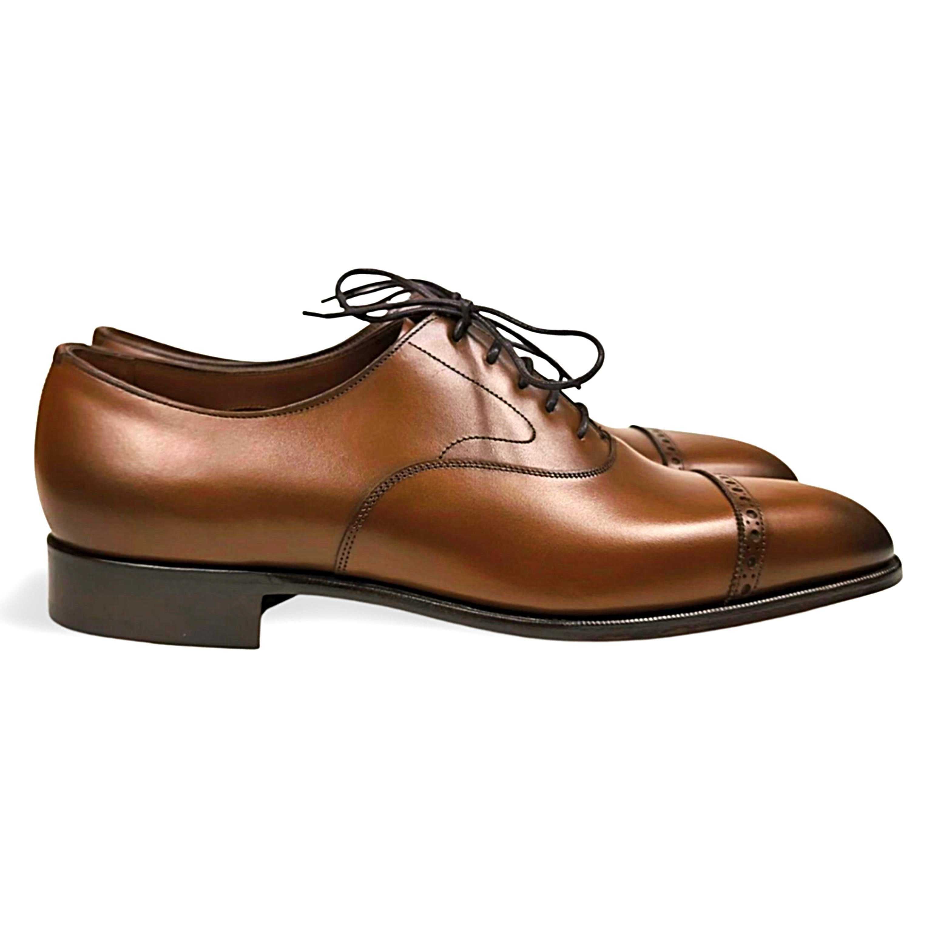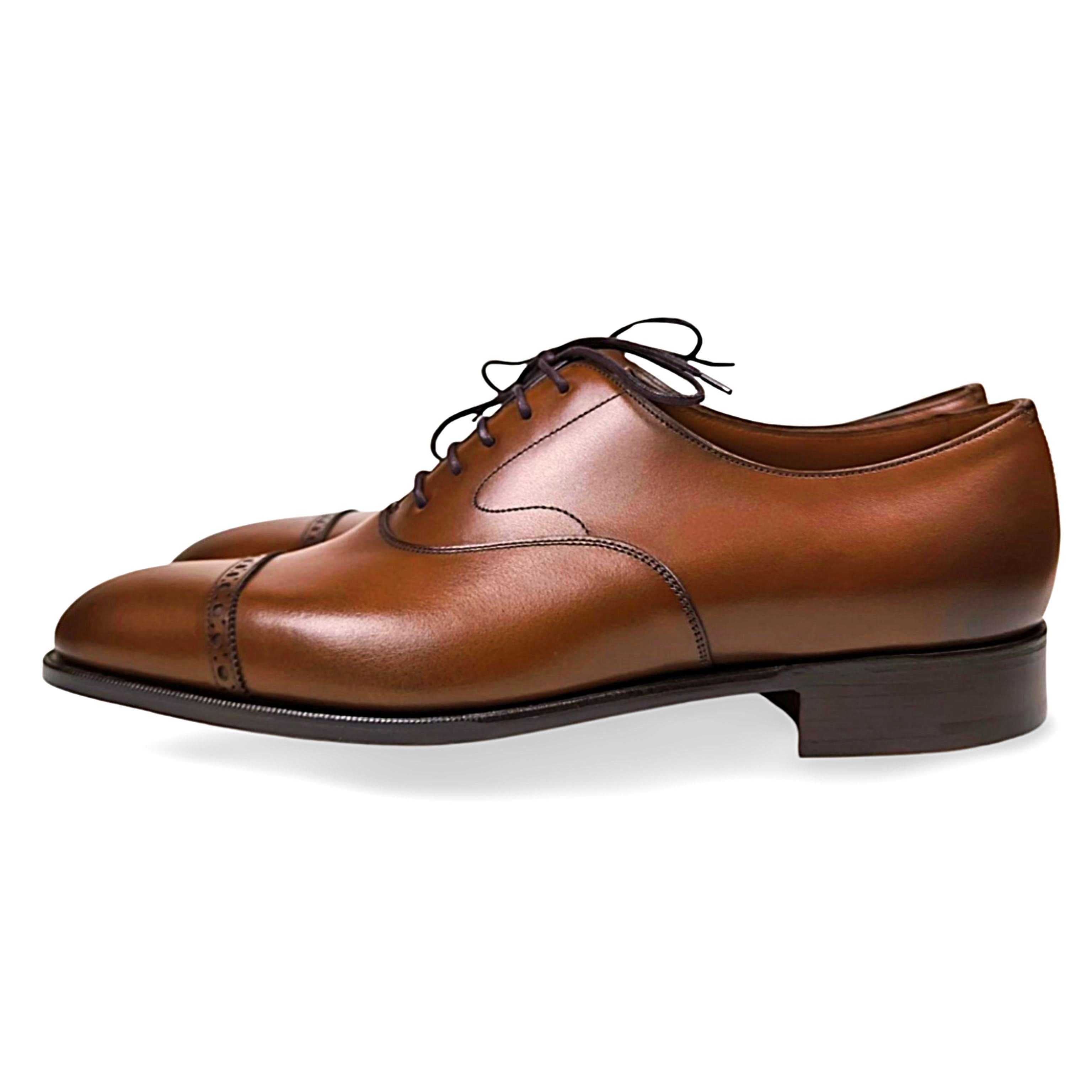 クラシカルなストレートチップだと固い印象になり過ぎることがありますが、ブローギングが施されたパンチドキャップトゥならば華やかな印象が加わり、スタイリッシュに履きこなすことができる逸品です。