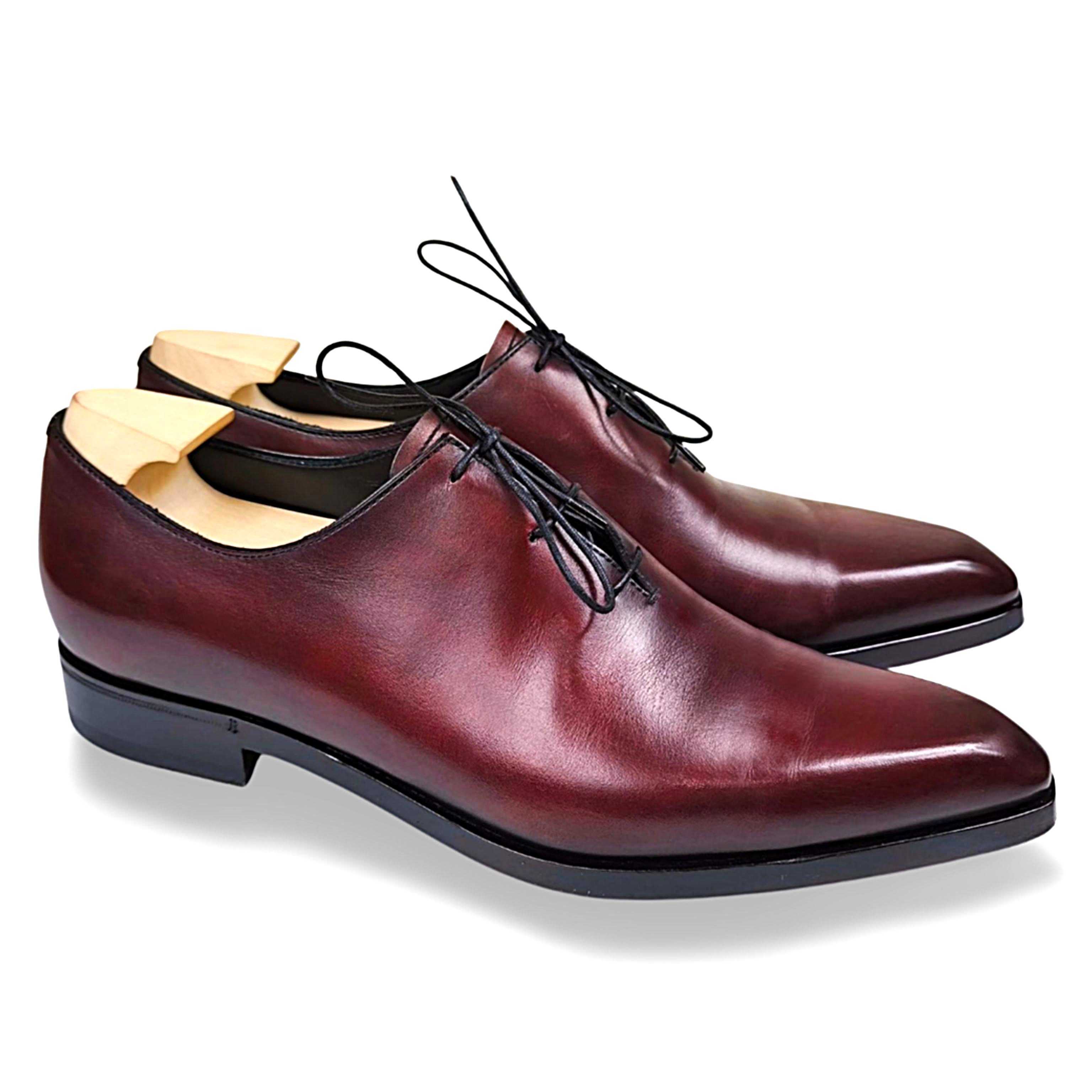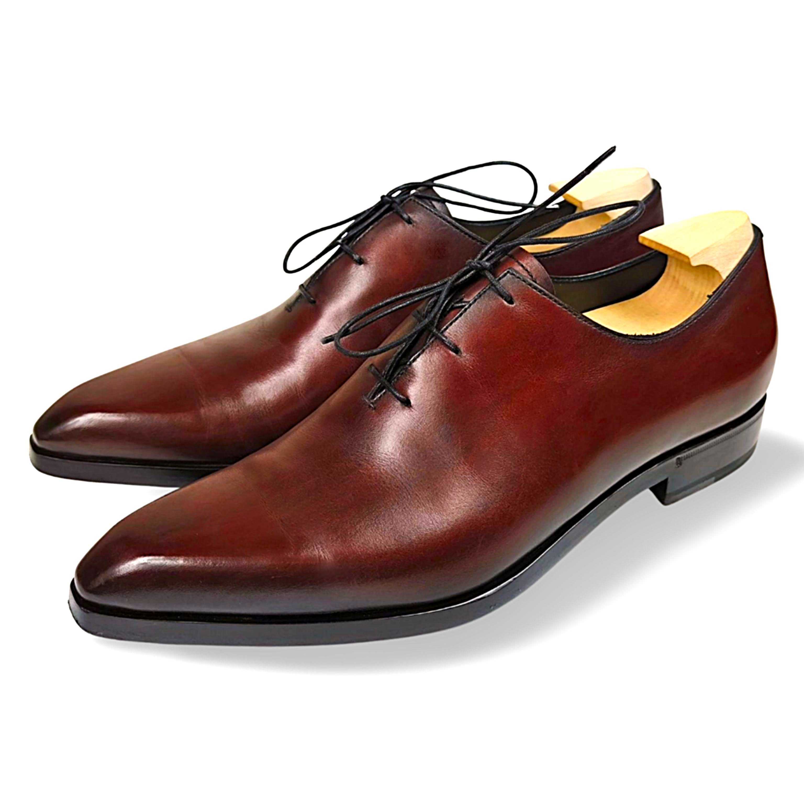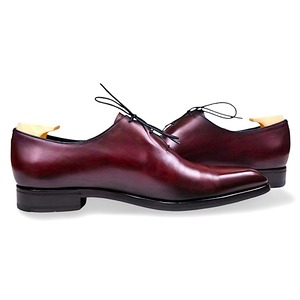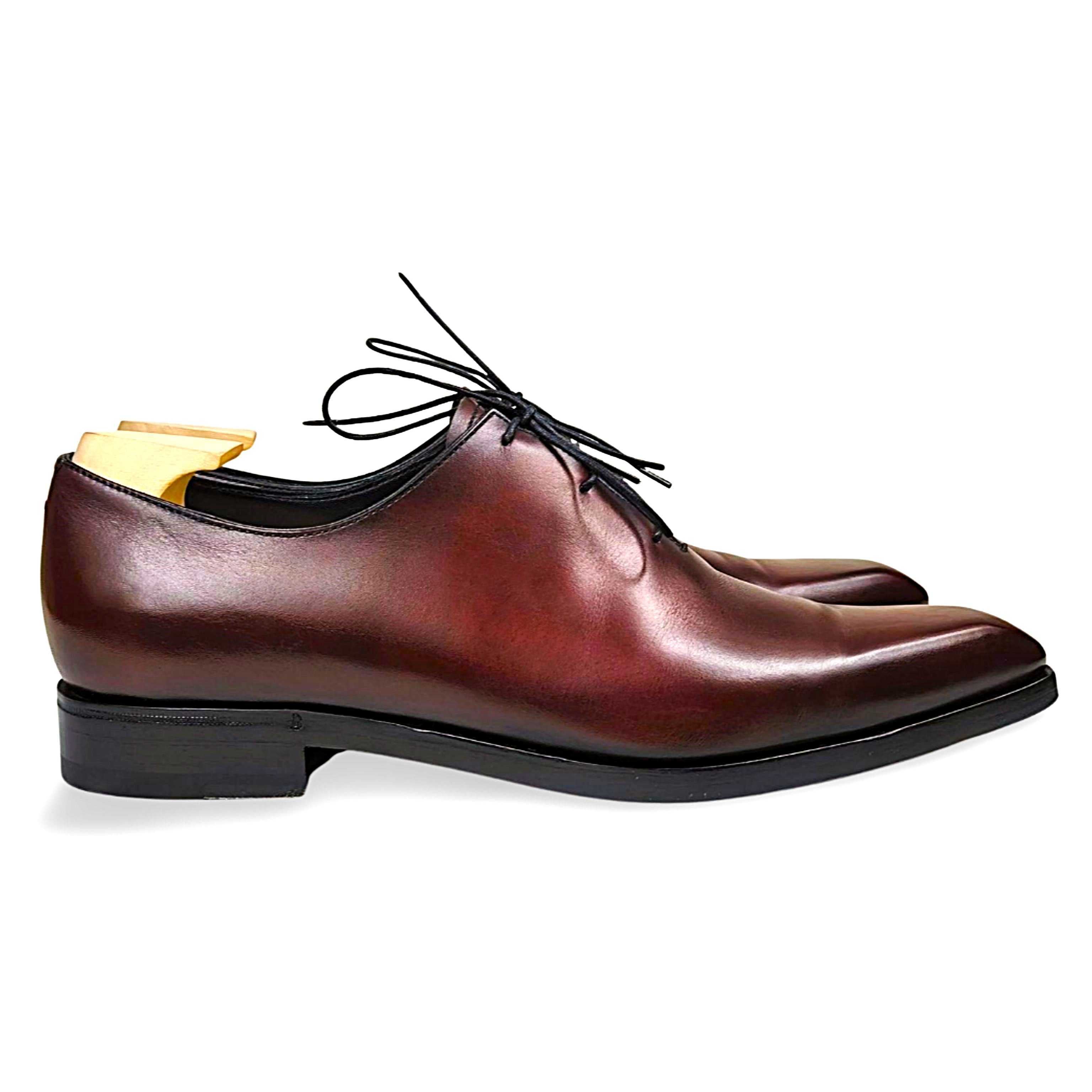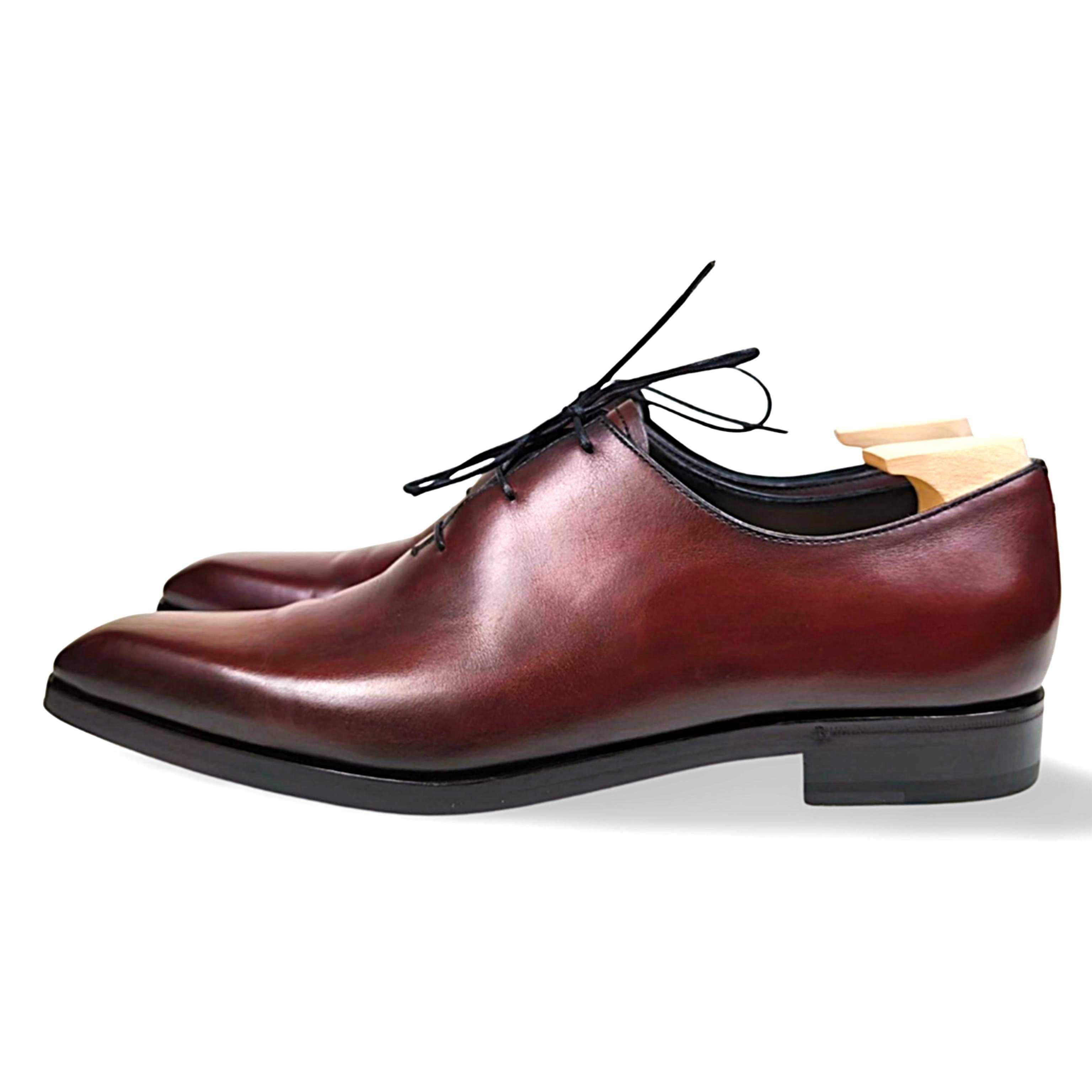 鬼才ハイダー・アッカーマンが初めてシューズデザインを手掛けた、2017AWコレクションの伝説的モデル。国内流通が極めて少ない、幻の一足です。伝統のホールカットをベースに、ポインテッドトゥと鋭角的なフォルムで極めてモダンに昇華。艶やかな赤褐色のパティーヌが色気を放ち、ソールには金色のメタルロゴが輝く特別仕様です。美しい立体感と快適な履き心地を両立し、ブランドの革新を象徴する、コレクター垂涎の希少な逸品です。