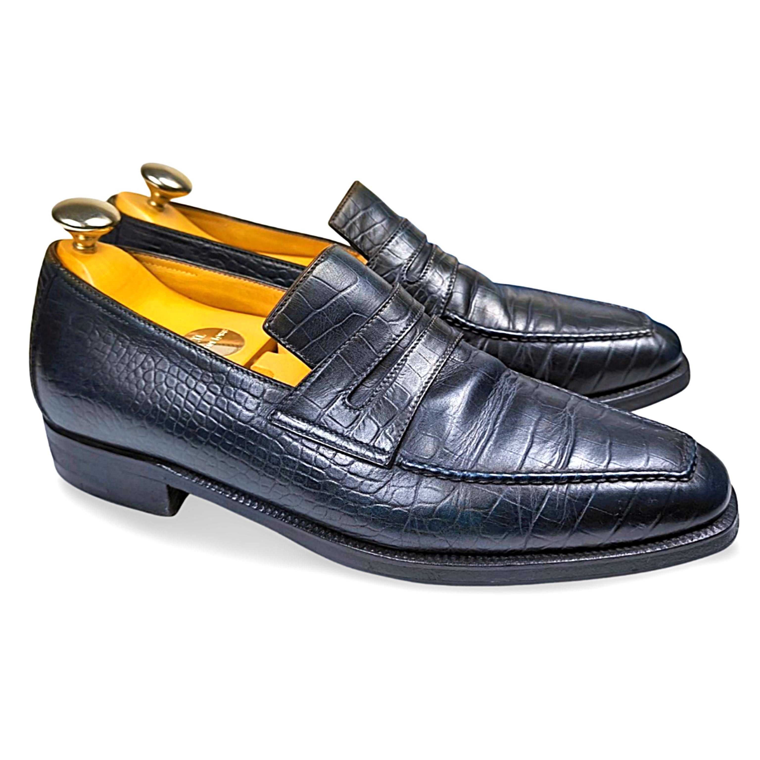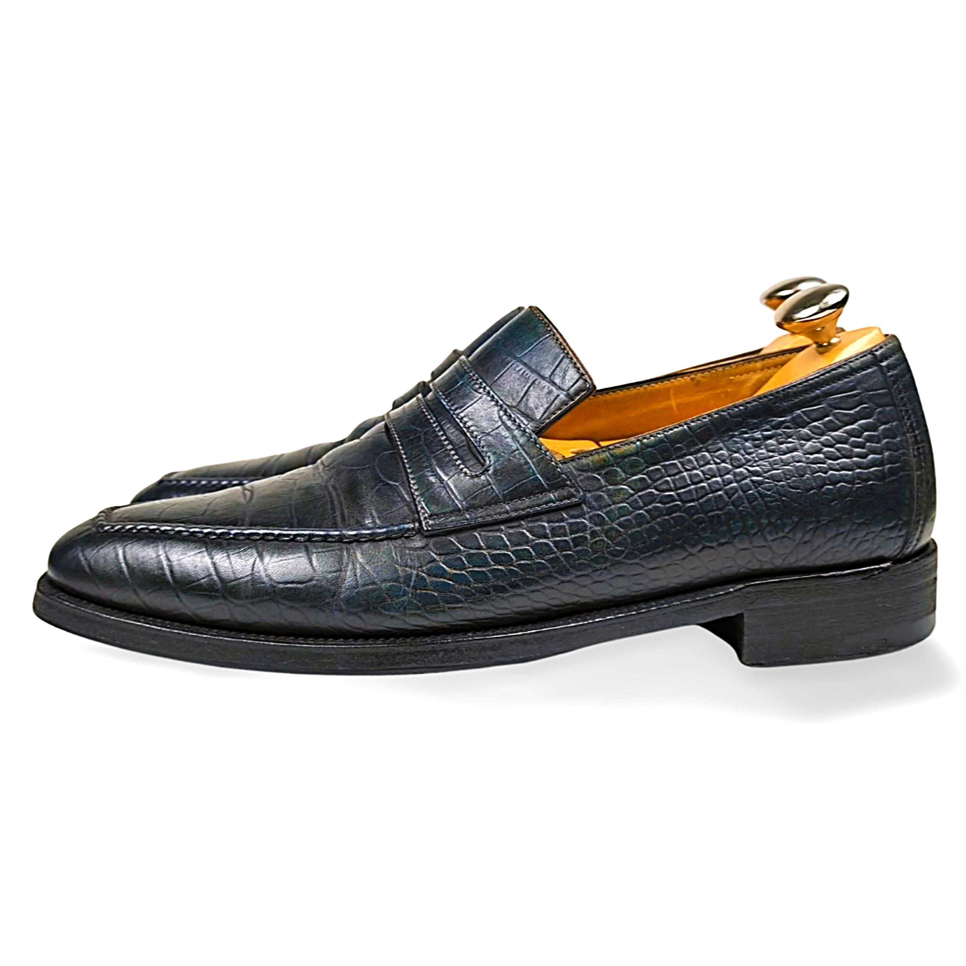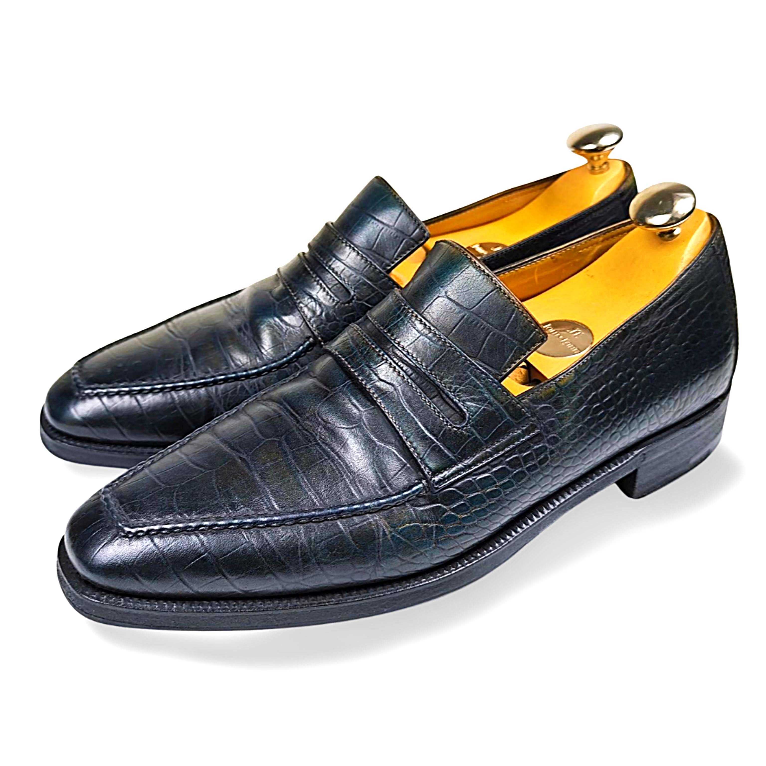 現代アートの巨匠アンディ・ウォーホルが愛した名作に、マダム・オルガ期が誇る伝説的なクロコ型押しを施した極めて希少な一足。ワニ革の美しさと牛革の堅牢さを両立させたこのレザーは、パティーヌによる色の変化も楽しむことができる名作です。クラブコレクションの木型が描く優美な曲線は、日本人の足にも心地よく馴染みます。現在はオーダー不可となった、メゾンの矜持と色気が凝縮された至高の逸品です。