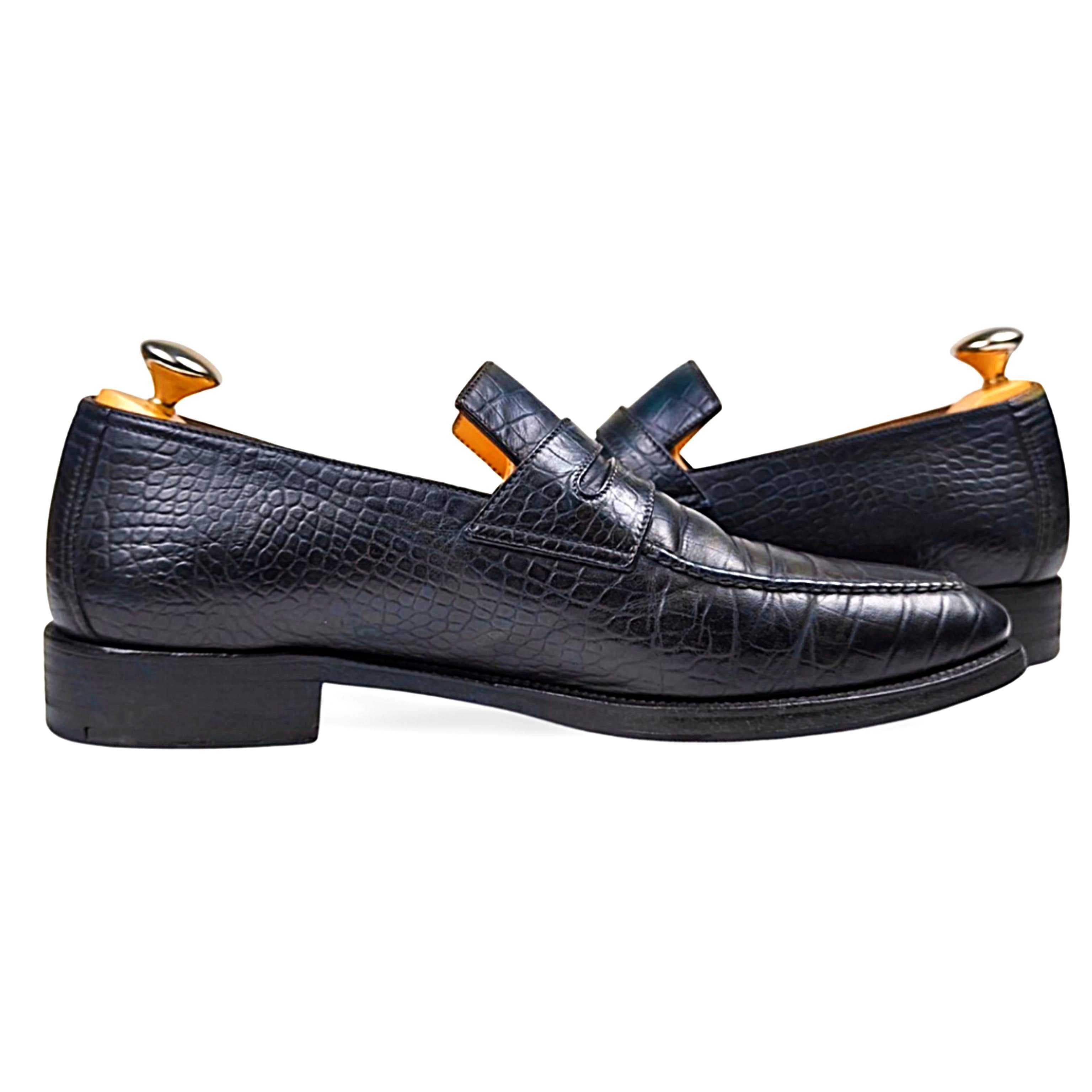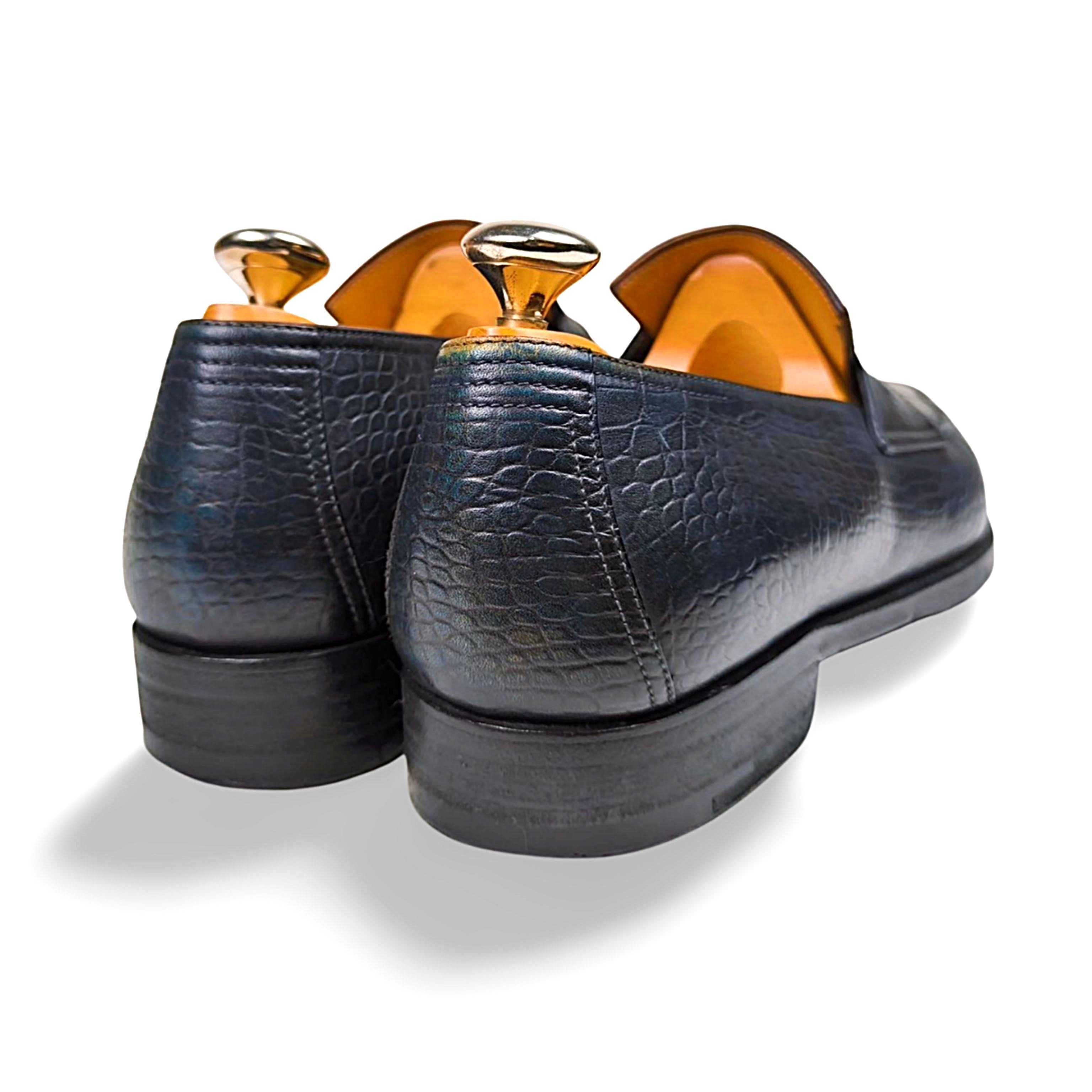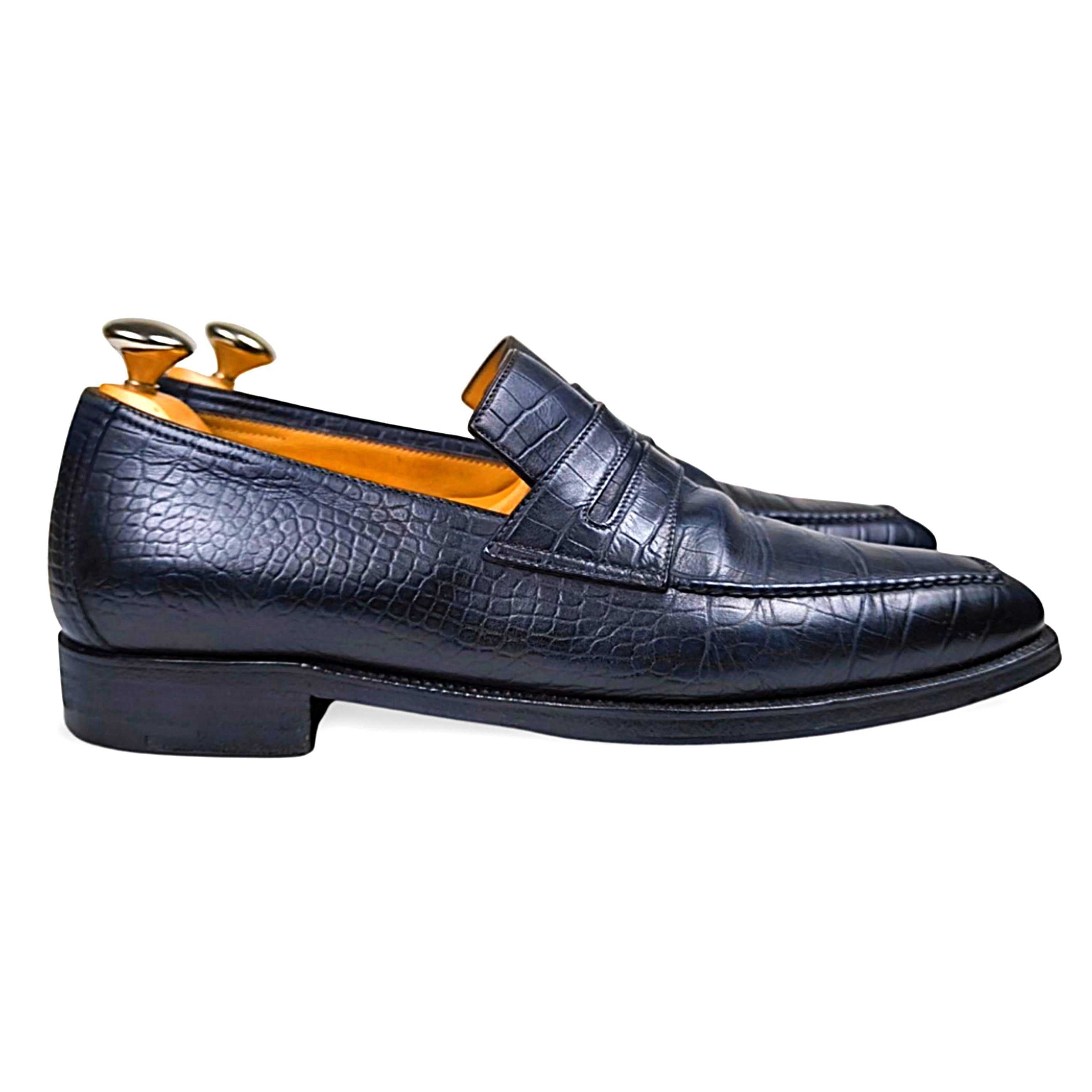 現代アートの巨匠アンディ・ウォーホルが愛した名作に、マダム・オルガ期が誇る伝説的なクロコ型押しを施した極めて希少な一足。ワニ革の美しさと牛革の堅牢さを両立させたこのレザーは、パティーヌによる色の変化も楽しむことができる名作です。クラブコレクションの木型が描く優美な曲線は、日本人の足にも心地よく馴染みます。現在はオーダー不可となった、メゾンの矜持と色気が凝縮された至高の逸品です。