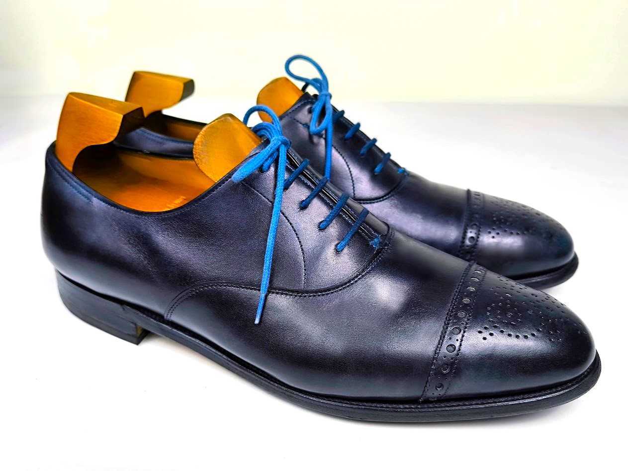 ジョンロブの精巧なつくりを元に、ポールスミスの真骨頂である「ひねりの効いたクラシック」により、ステッチ及びシューレースが全て落ち着いたブルーで統一されており、高級感がありながらも大変遊びの効いたデザインです。