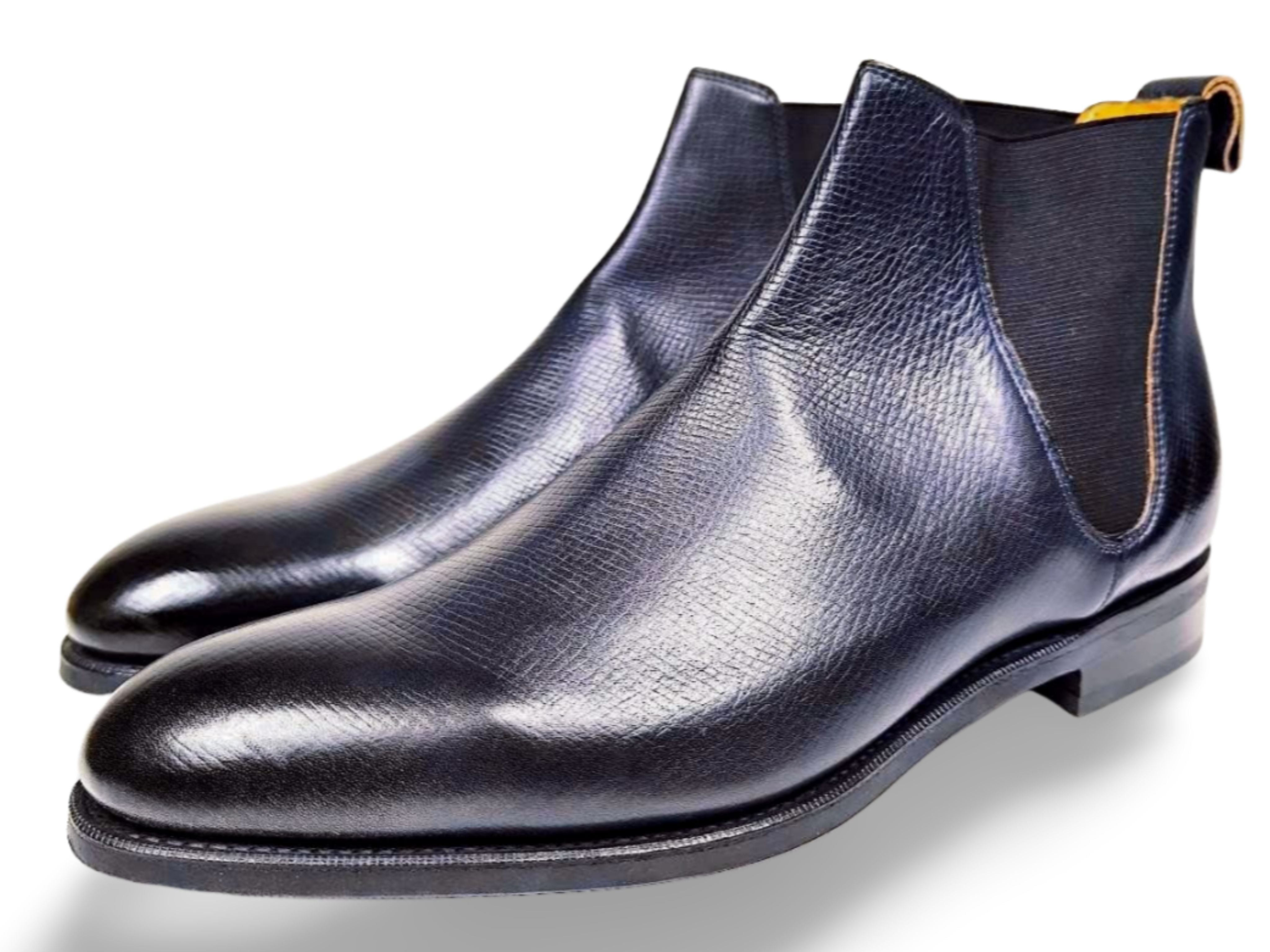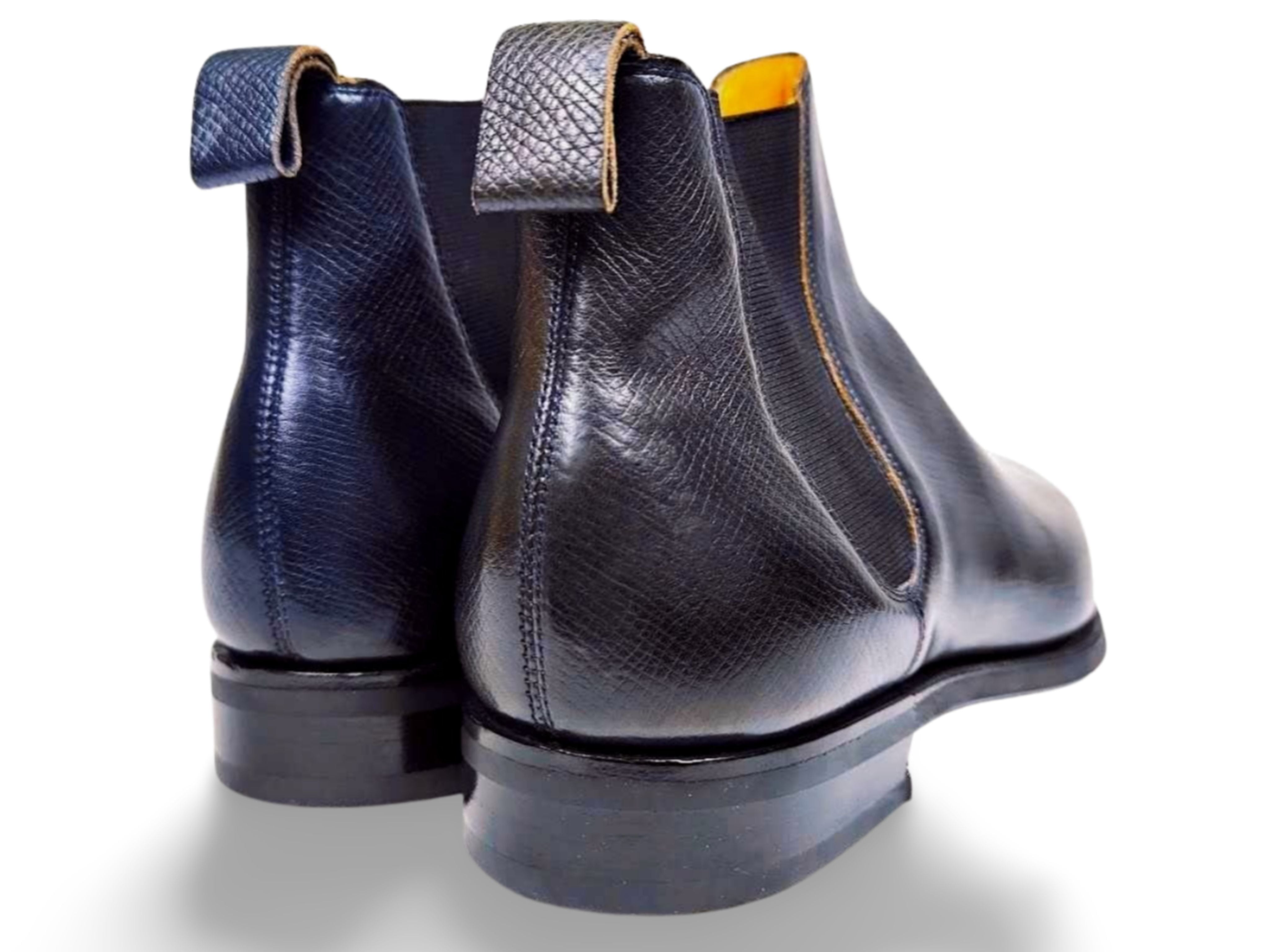 V字型のサイドゴアやスマートなシェイプ、コバの張り出しを抑えた薄手のソールなど、エレガンス漂うドレスブーツです。ユタカーフは、通常のカーフに比べ油分を多く含んでいる為、耐水性のある皮革できめ細かい分退色も起きにくく、このエレガントな表情を長くお楽しみいただけます。
