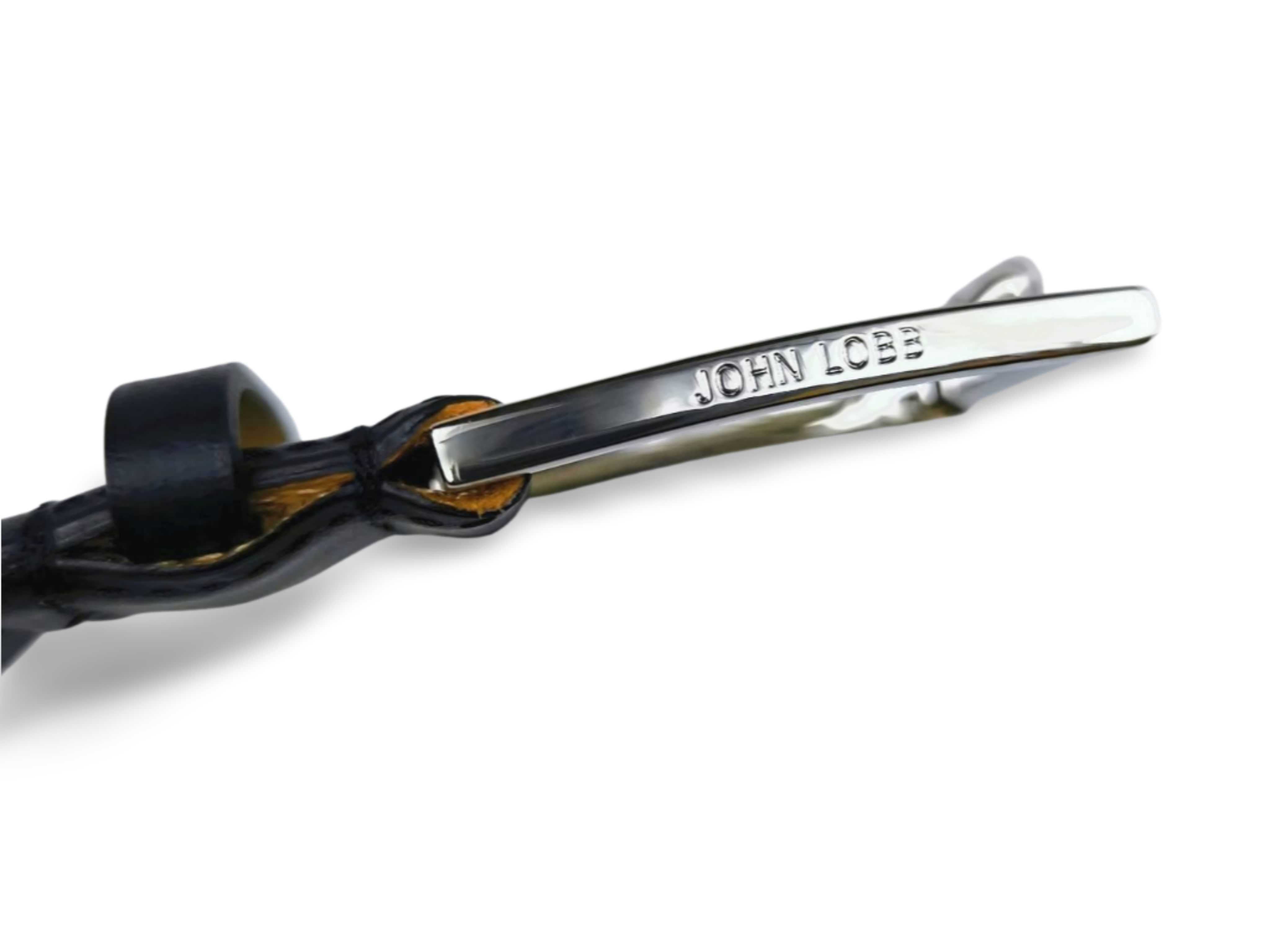ジョンロブのロゴは光沢のあるパラジウムバックルの上部に鎮座しています。